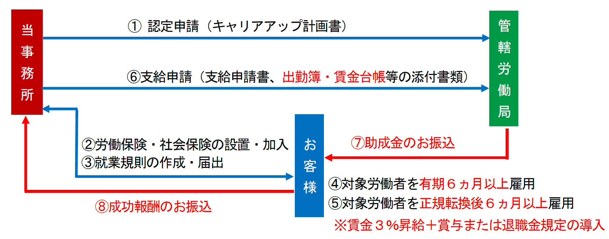 | 5. 該当の助成金を管轄行政へ認定申請提出・申請 ※当事務所が代行 |