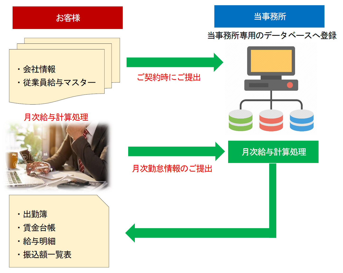 | 月次給与計算処理 | 出勤簿・賃金台帳・給与明細・振込額一覧表 |